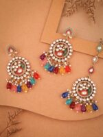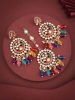 Add a burst of vibrant elegance to your ethnic collection with this handcrafted Meenakari Kundan Chandbali earring and maang tikka set, richly adorned with traditional artistry. These earrings feature a beautifully enameled Meenakari design in red and green, highlighted with intricate Kundan stone settings in a circular chandbali frame. Surrounding the centerpiece are delicate pearl accents, while the base is embellished with multicolor teardrop beads in shades of blue, red, yellow, pink, and more—creating a playful yet regal look. Paired with a matching tikka, this set is perfect for festive occasions, weddings, or cultural celebrations, offering a complete and striking traditional ensemble.