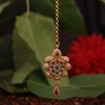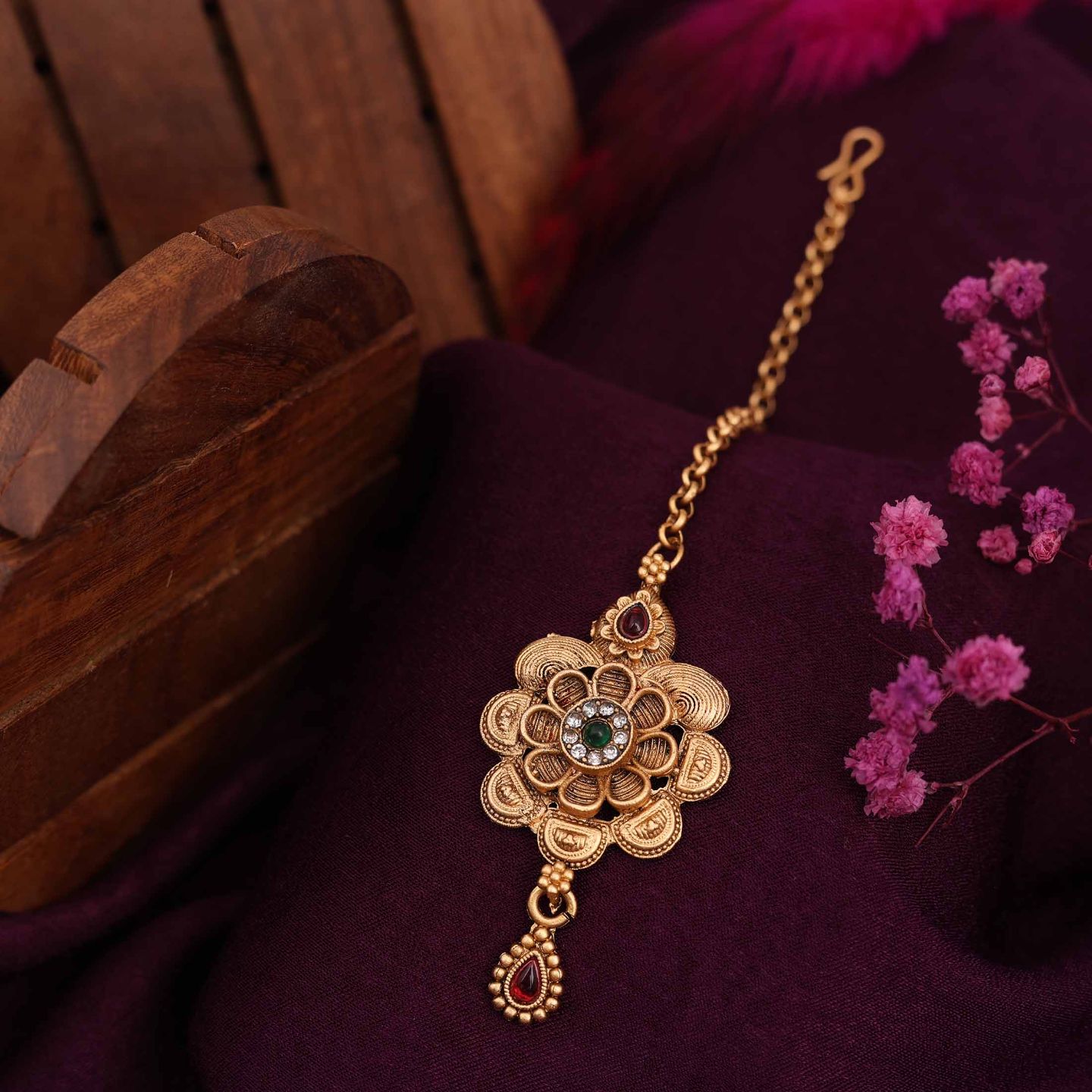 Introducing the all-new, exclusive Antique Gold tikka, Crafted in the purest metal in jewelry, the ravishing jewel is adorned with gold plating to celebrate your inner beauty. Embellished with a classy tone of kundan red-green combination, Let these stunning masterpieces showcase your beautiful frame to the world. Perfect for every occasion.